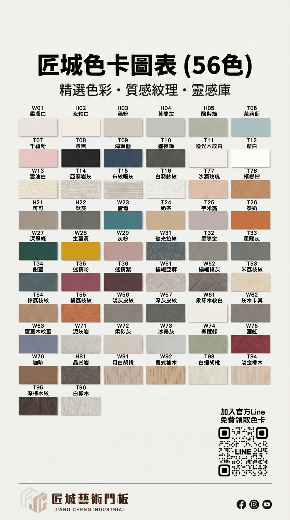 匠城藝術門板領先業界! 我們色卡即將擴張至 56 色~ 歡迎設計師索取全新色卡,與我們一同翻玩空間可能! 『想要更個性化、更跟得上潮流!』 Line免費諮詢 & 領取色卡 LINE ID:@232wqfea 即刻享有專人免費諮詢服務,還能免費索取實體色卡喔!